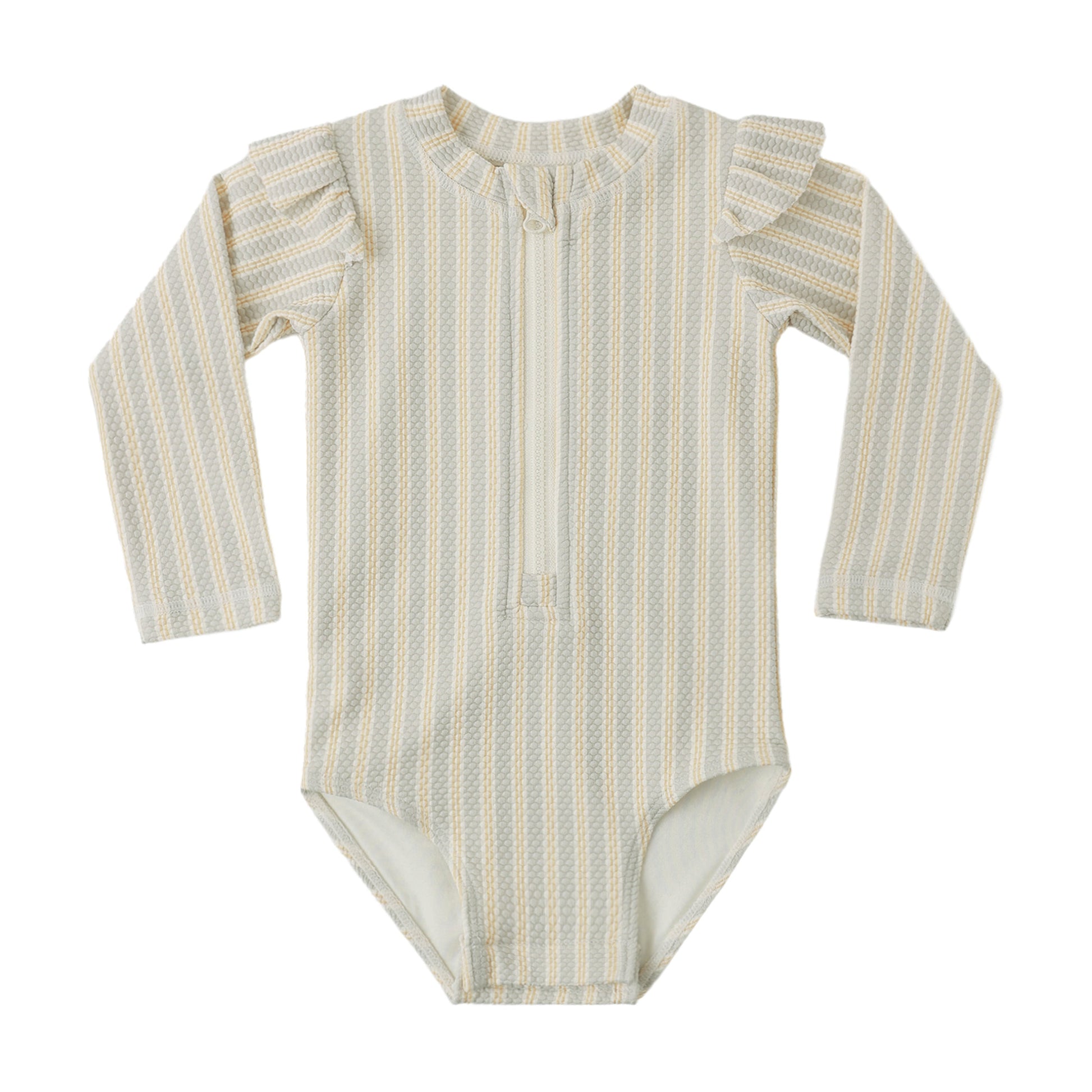 This one-piece rashguard swimsuit will have your little one protected from the sun in style. Featuring a front zipper closure and ruffle detail at the shoulders.