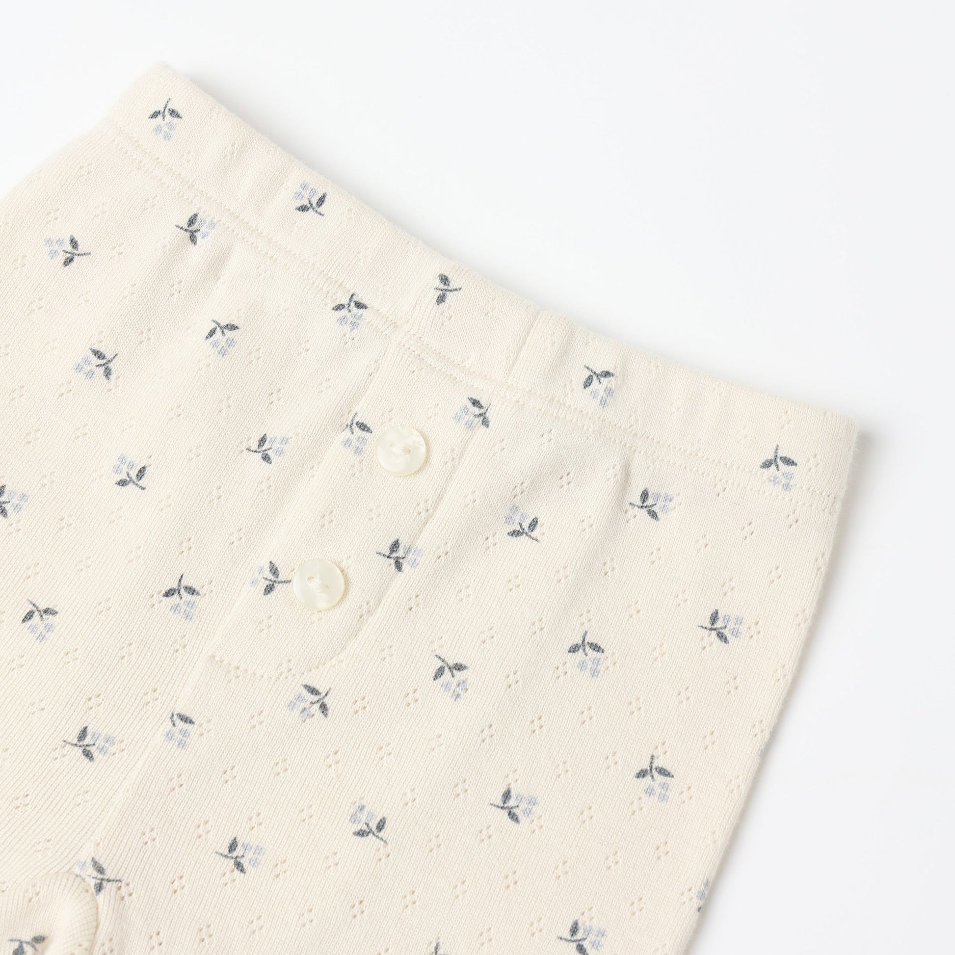 This sweet pointelle set features a long sleeve shirt and leggings with an elastic waistband and faux shell buttons at center front.