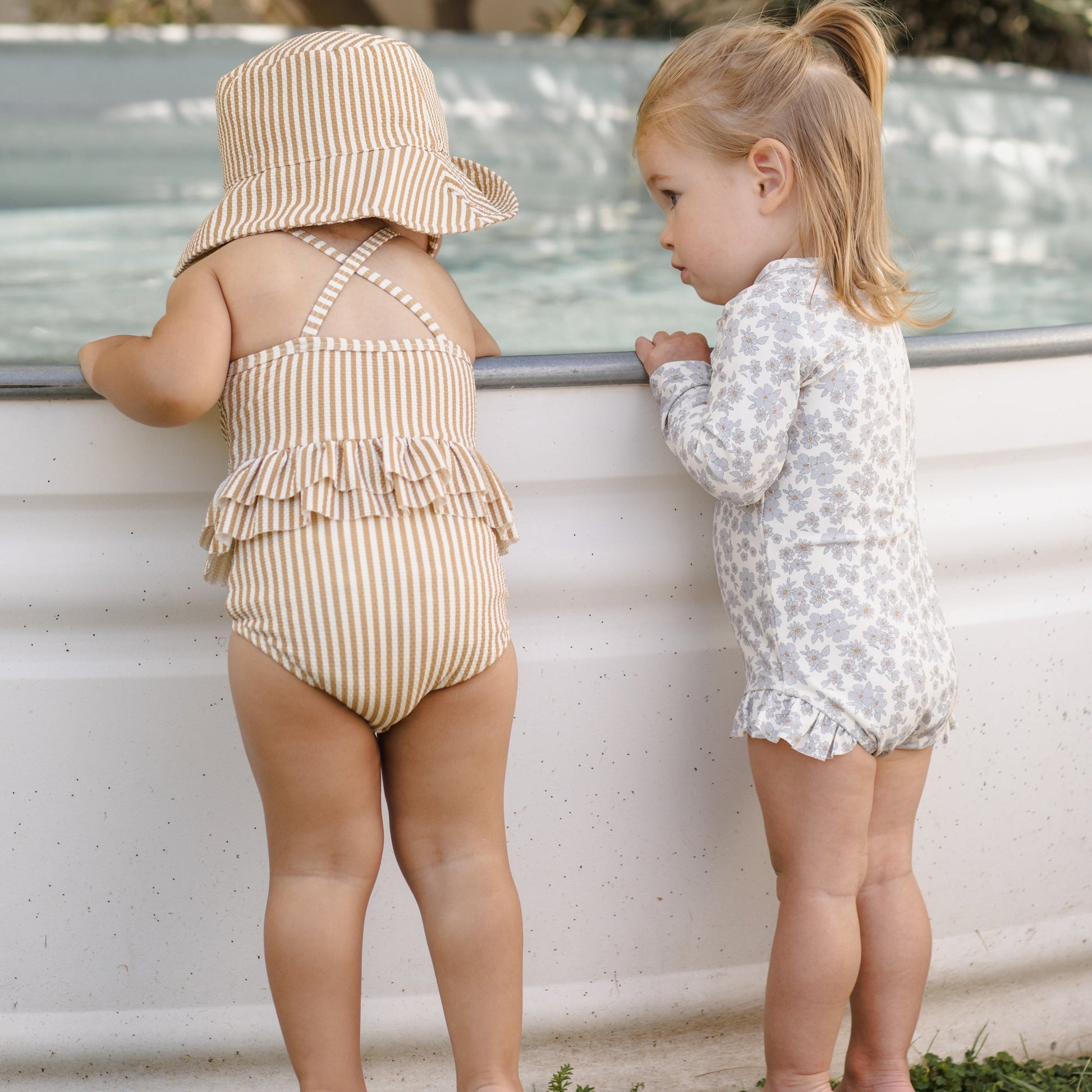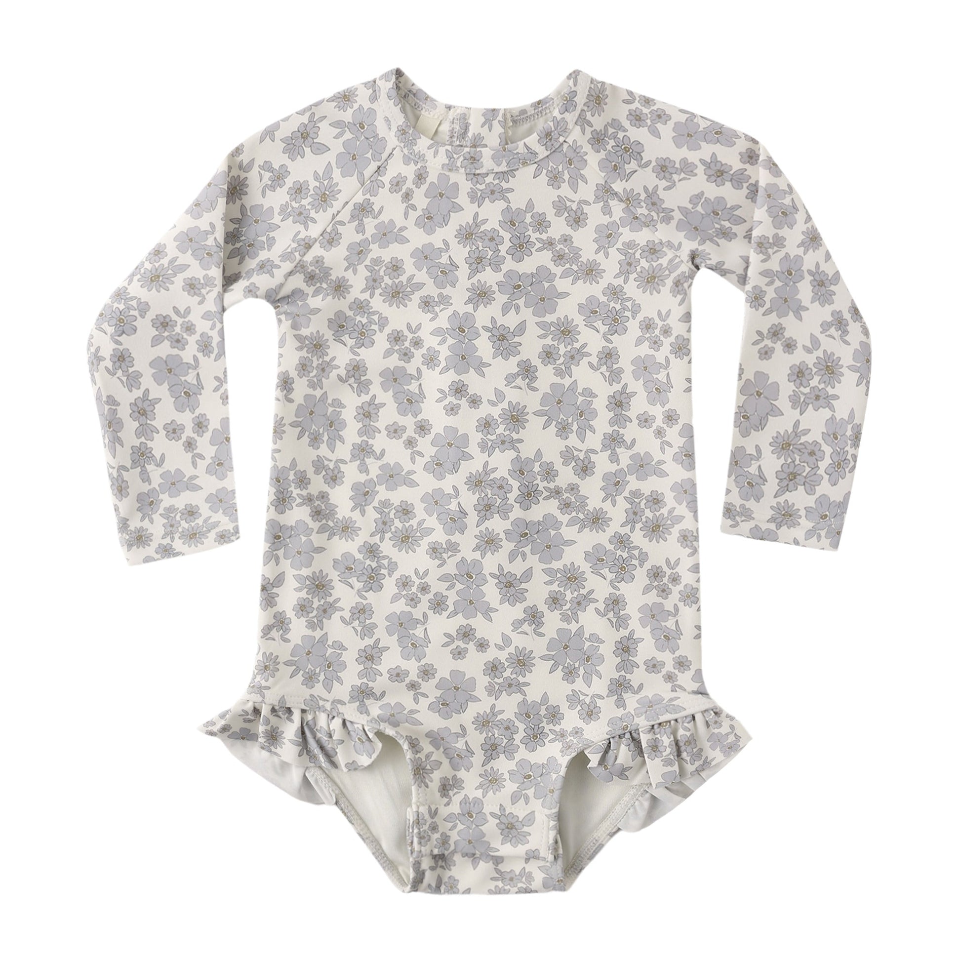This one-piece rashguard swimsuit will keep your little one protected from the sun in style. Featuring a back zip closure and ruffle detail at the leg openings.