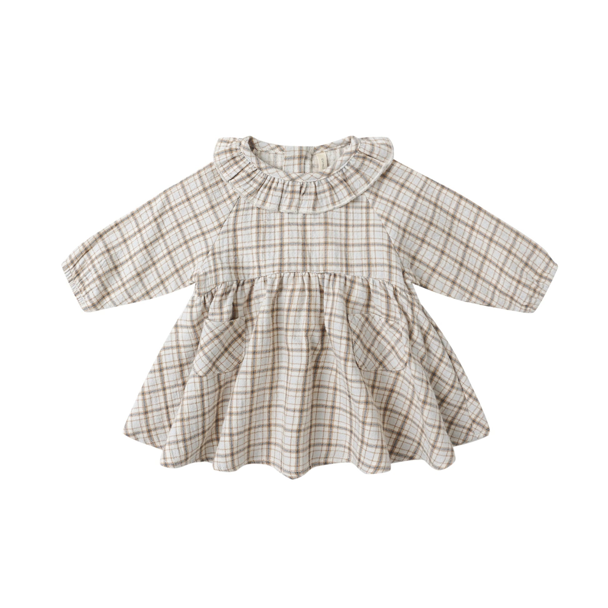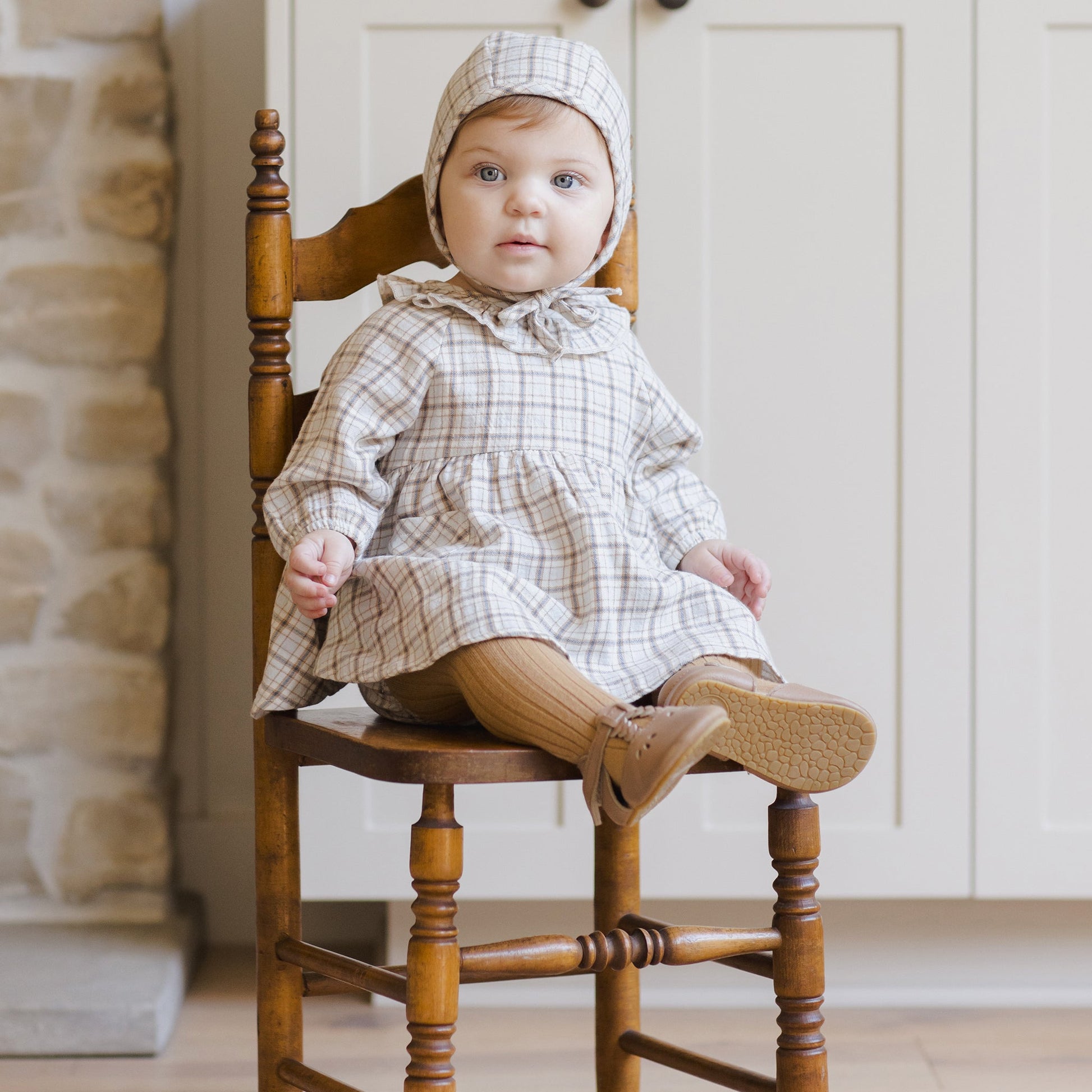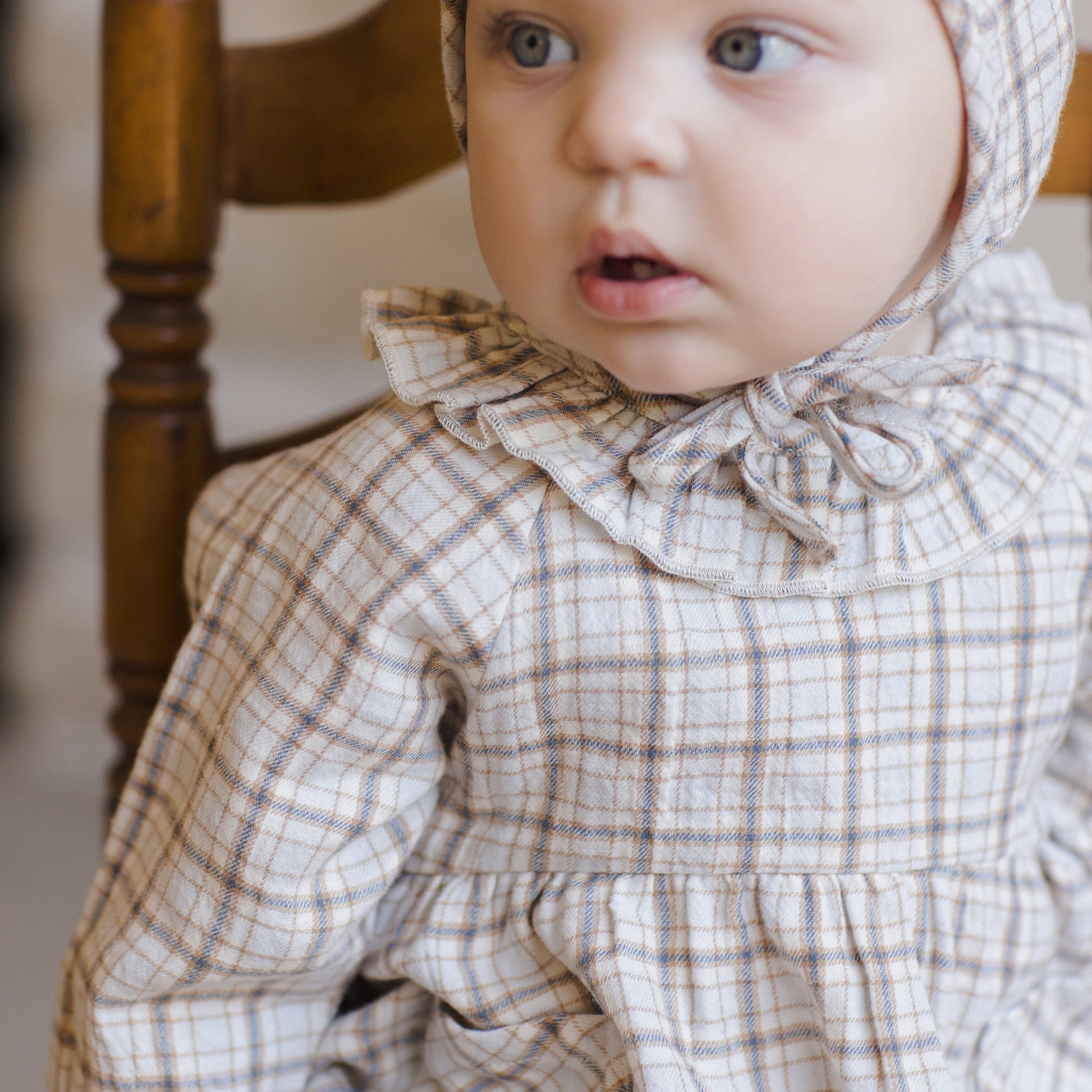 Our sweet Simone Dress features long sleeves, a curved waistline, front patch pockets, and a darling collar. A zipper at the back allows for easy dressing—perfect for everyday charm and comfort. Coordinating bloomers included with all sizes.