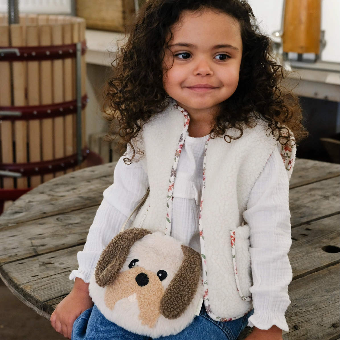 Our darling Dolly Dog will set little tails wagging! Made from the softest faux fur fabric, with floppy boucle ears, boucle moustache and a sweet embroiderry face. Fully lined in brown heart scattered fabric, this bag features a magnetic dot closure and a strap with a break point for safety.
