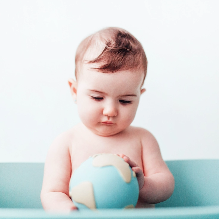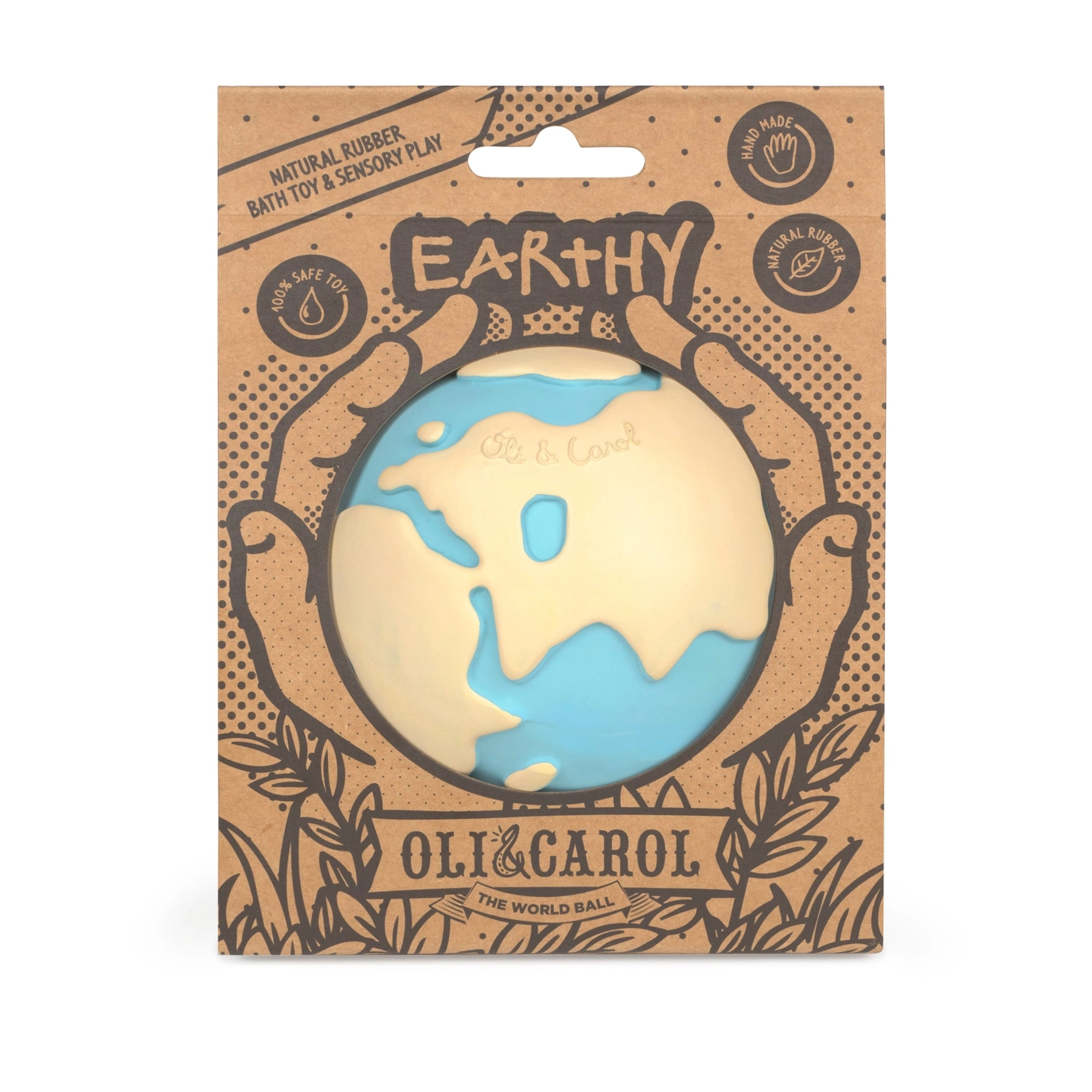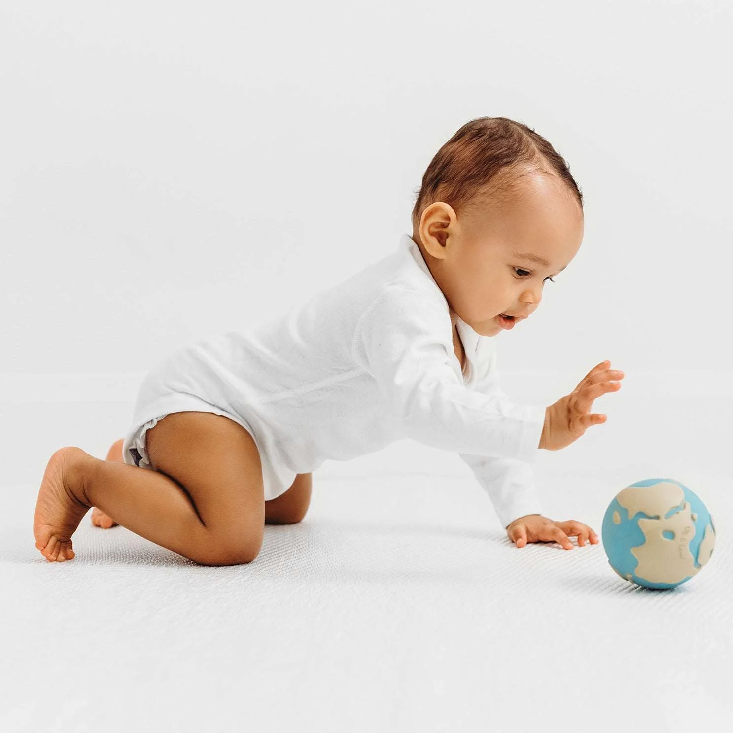 EARTHY the WORLD BALL is a natural rubber baby toy for teething, bath time and sensory play. Hand painted with natural pigments for safe and worry-free play!
