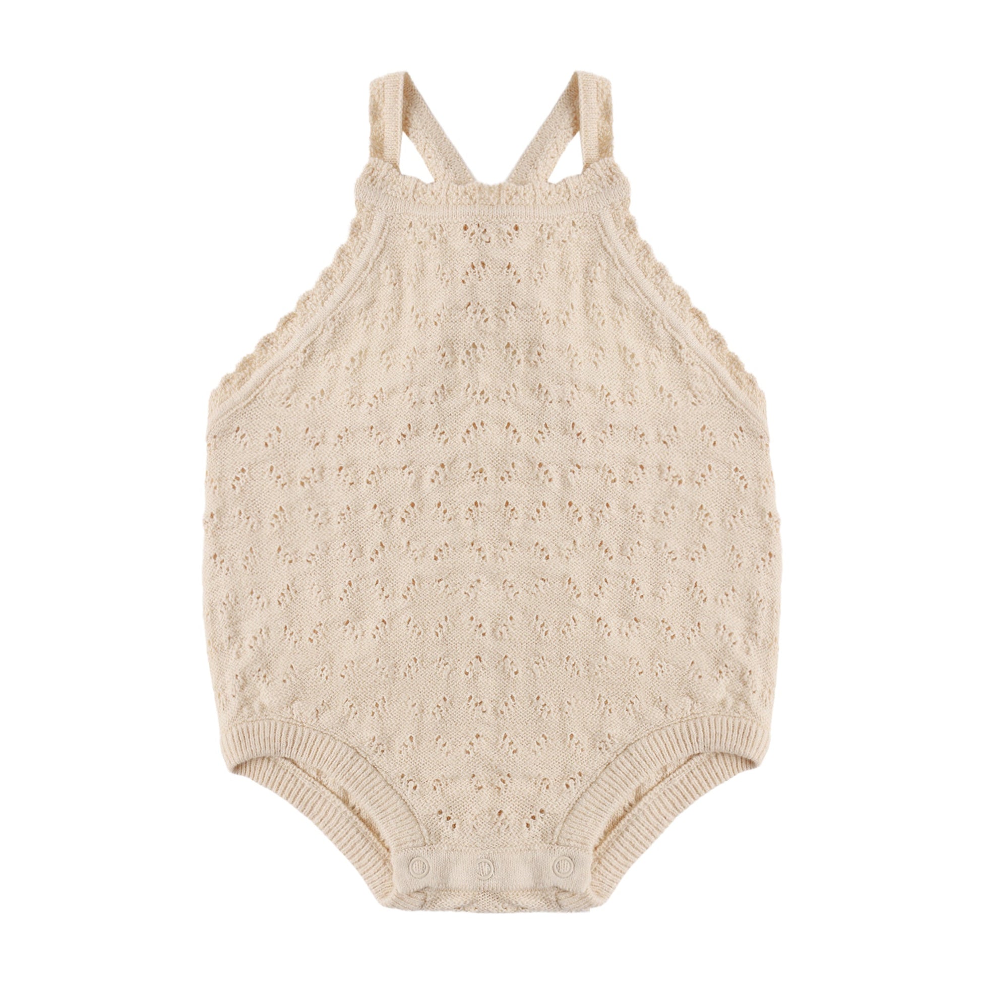 Our Annie Knit Romper features knit scallop edge detail on straps and neckline with snaps at the bottom for easy changes.