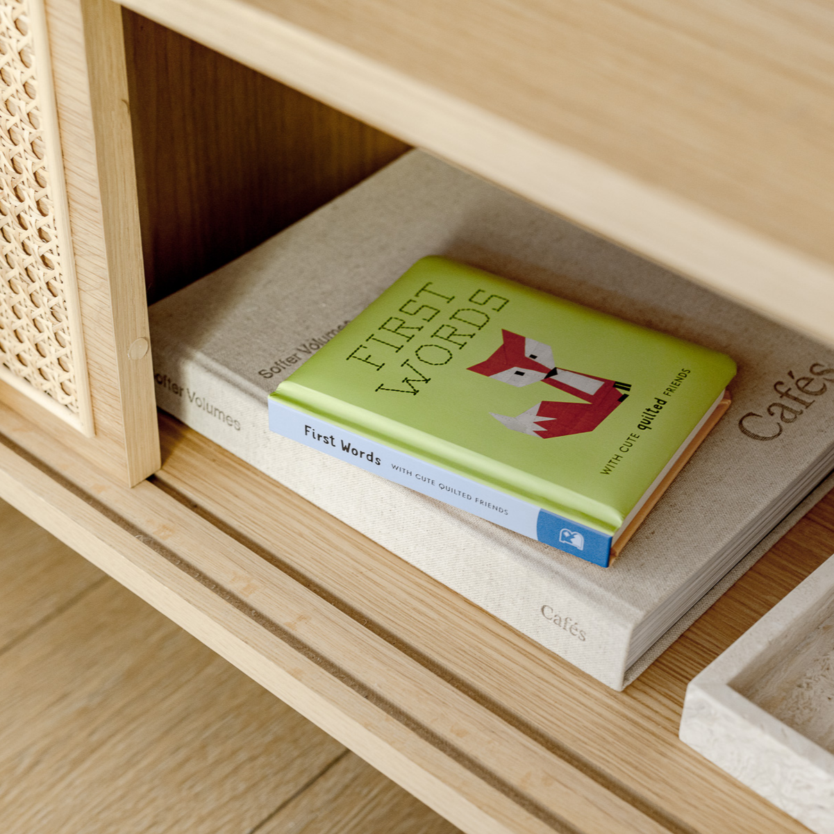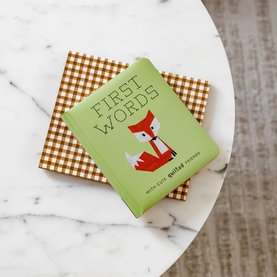 • Handmade quilt imagery brings a cozy, artisan aesthetic to baby’s first words