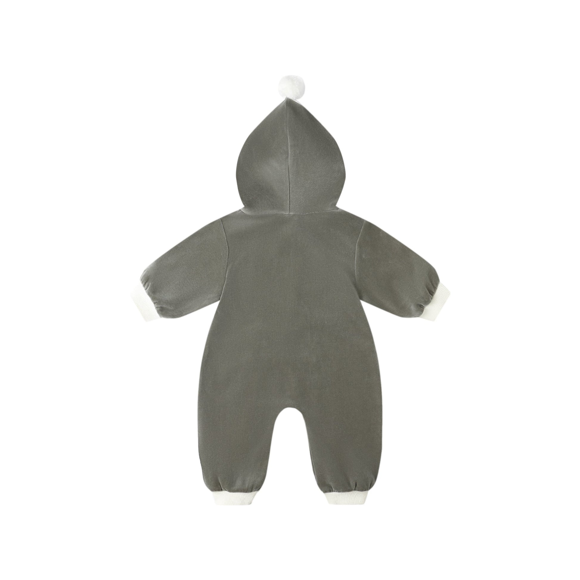 Longsleeve hooded fleece jumpsuit with ribbed sleeve and leg openings, a zipper down the front, and a hoodie with a pom pom on top.