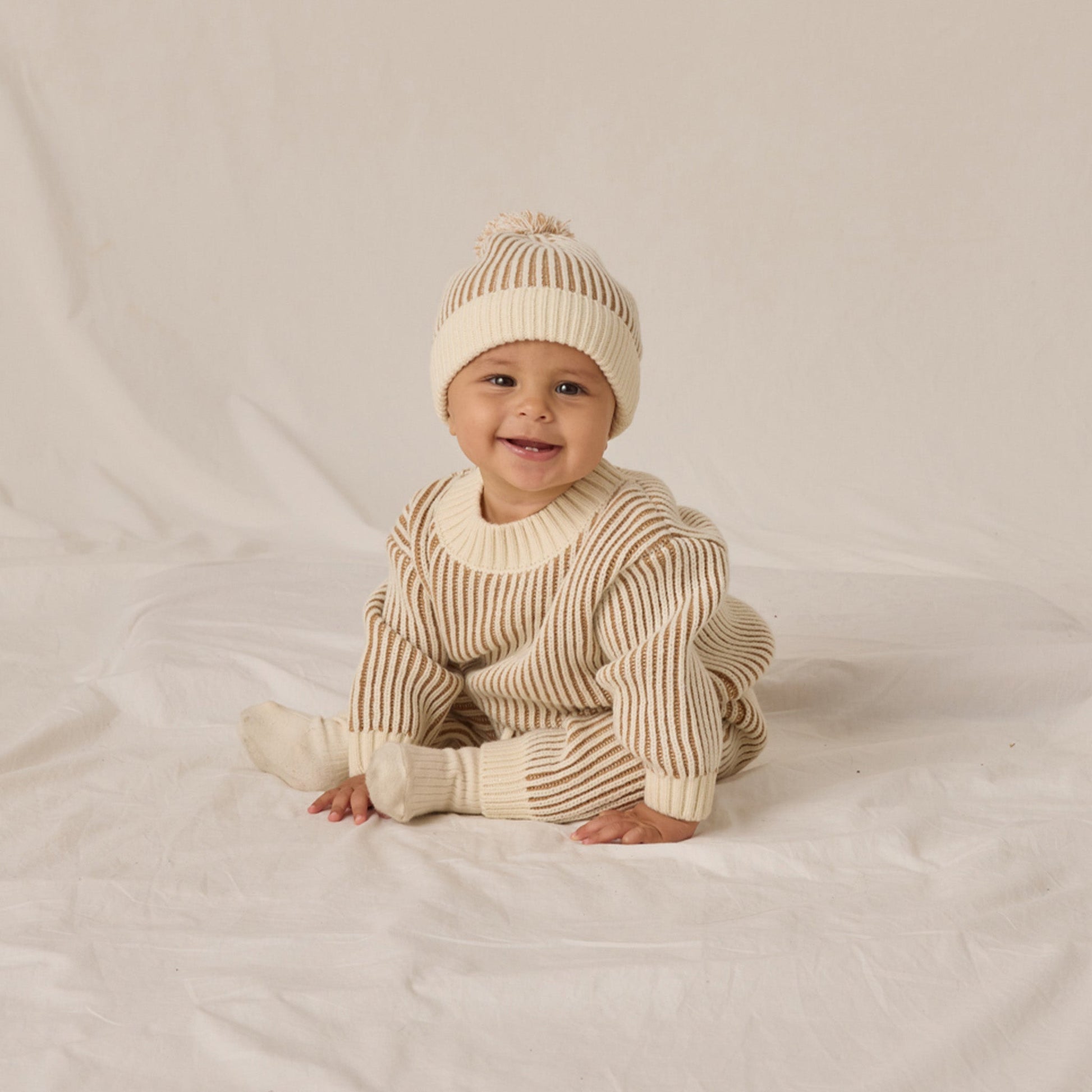This cozy knit beanie features contrast ribbing and a playful pom pom, making it the perfect finishing touch for little ones’ cold-weather outfits.