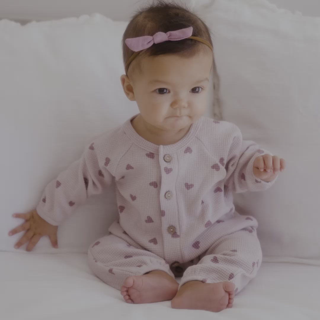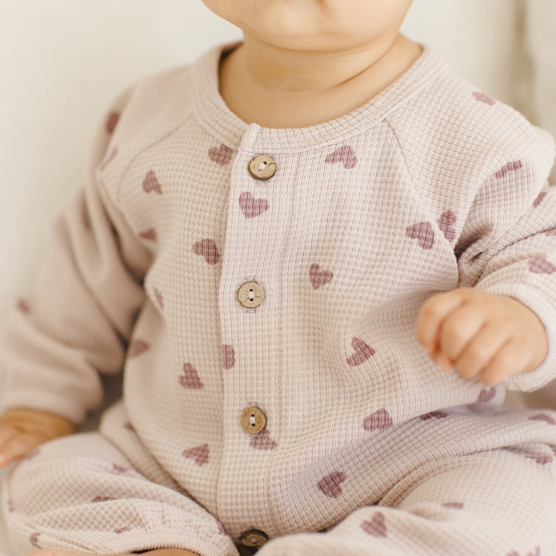 This cozy waffle knit raglan jumpsuit features coconut buttons down the chest and elastic at the wrists and ankles for a comfy fit.