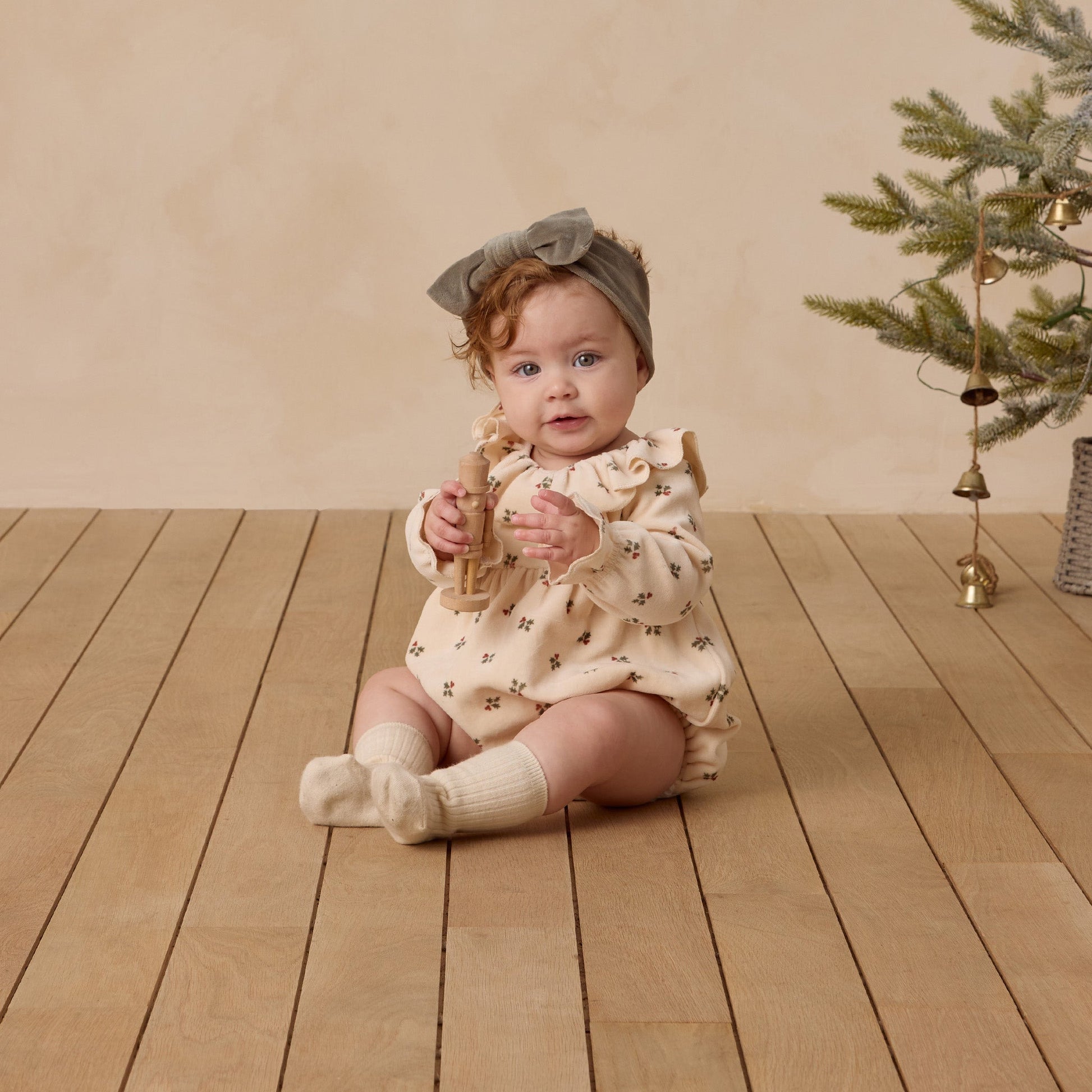 Our Adelaide Romper features a delicate square neckline, smocked detailing at the front and back, long puffed sleeves, and convenient bottom snaps for easy changes.
