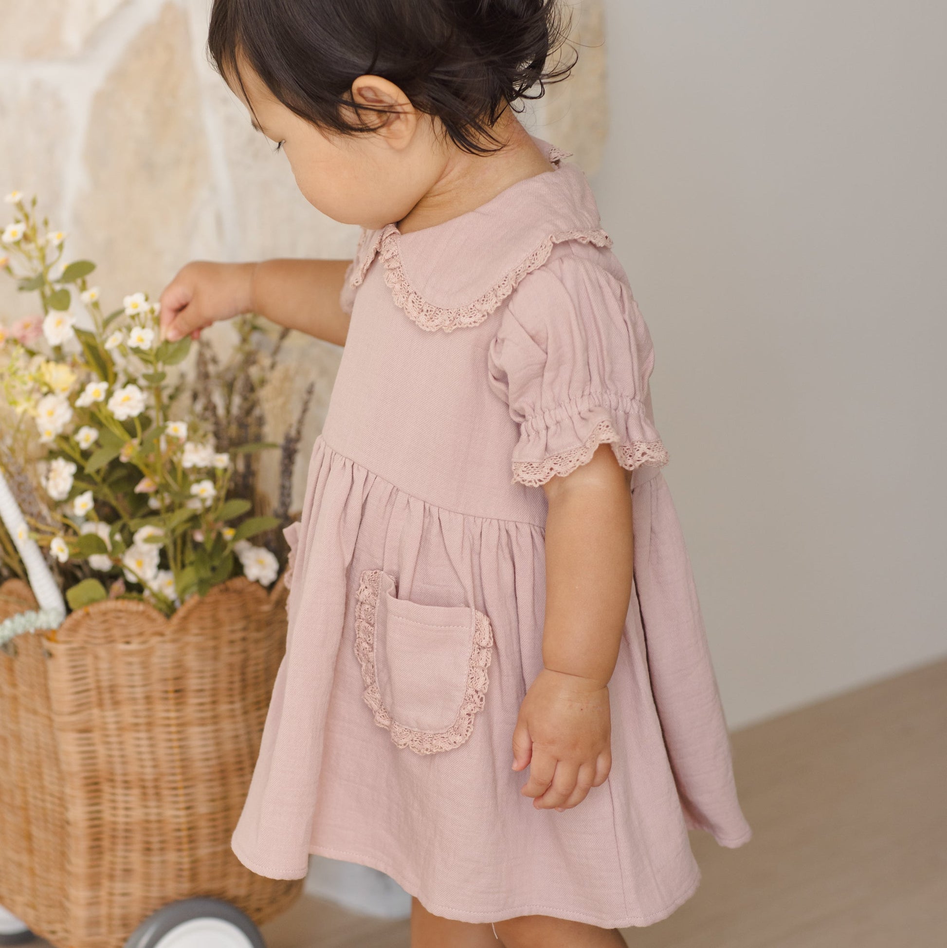 Our Marisol Dress features a Peter Pan collar, patch pockets, and full gathered short sleeves—all adorned with delicate lace ruffle trim—and coconut buttons at the back for easy dressing. Coordinating bloomers included with all sizes.
