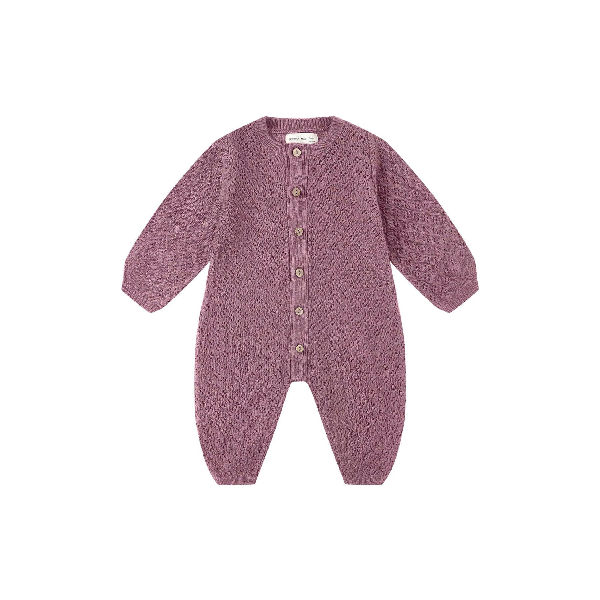This long sleeve romper, crafted from soft pointelle fabric, features front coconut buttons and a darling bubble silhouette.