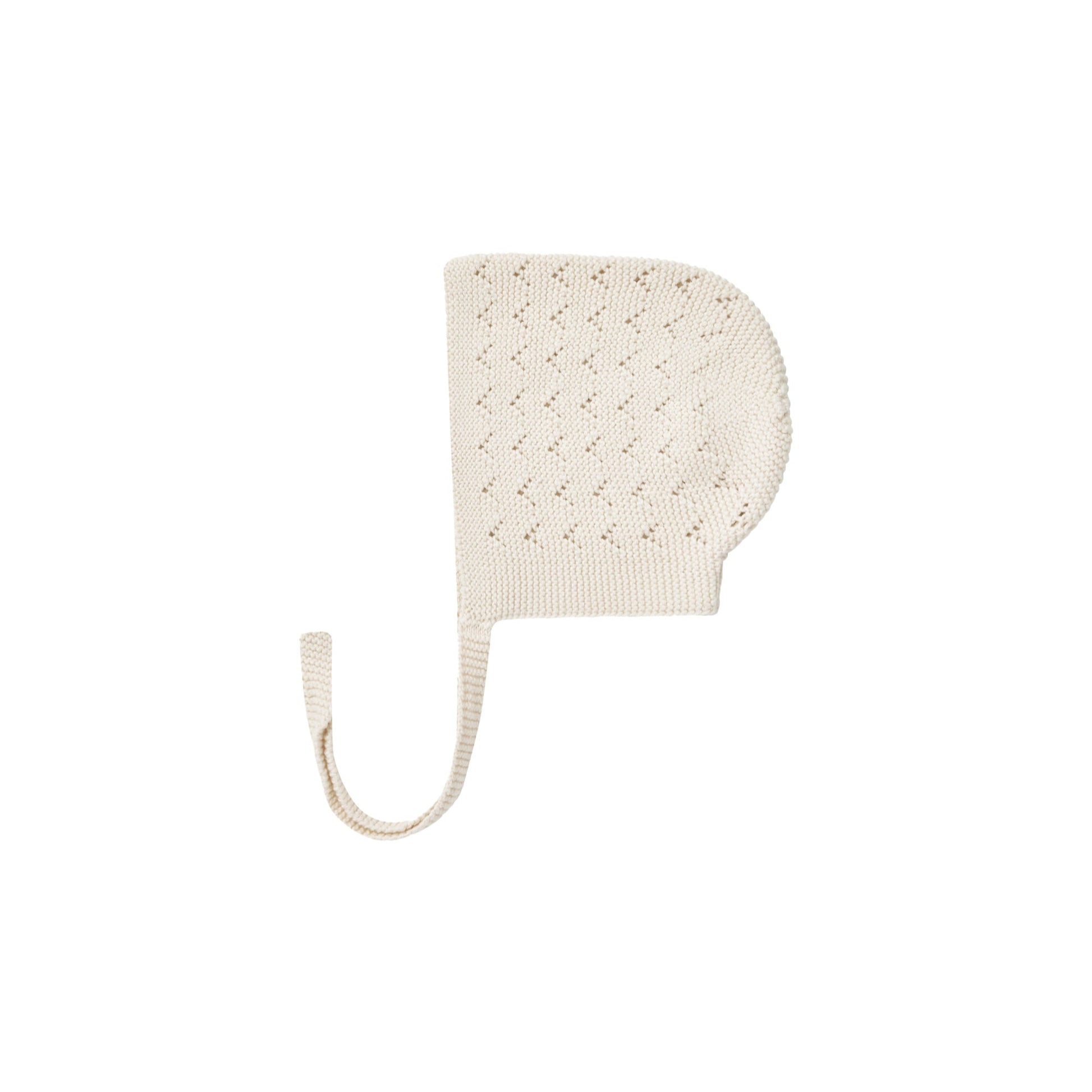 Pointelle sweater knit bonnet with classic chin ties—a charming accessory for cooler days.