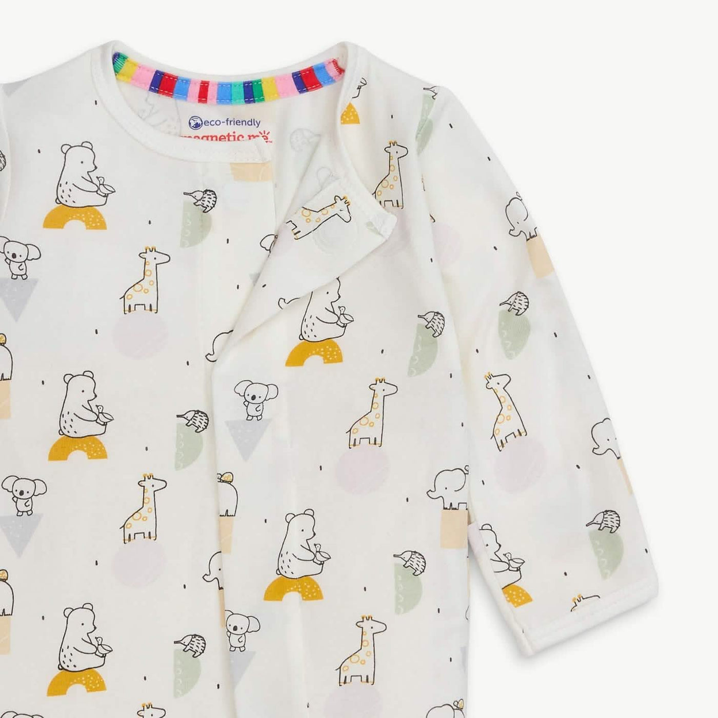 - Magnetic closures: magnets line the seam from the neck to upper thigh for sizes up to 0-3m & from neck to crotch for sizes 3-6m and up.