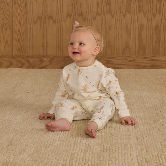 This comfortable cotton jersey set includes a relaxed long sleeve crewneck tee and dropped-crotch slouch pants. Shoulder snaps included on sizes 0–3M - 6–12M for easy changes.