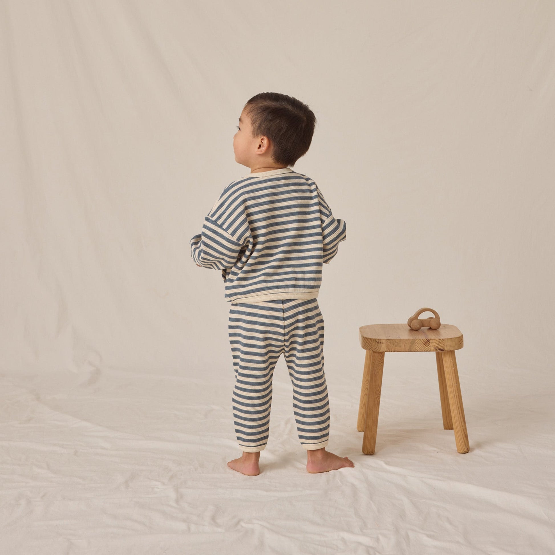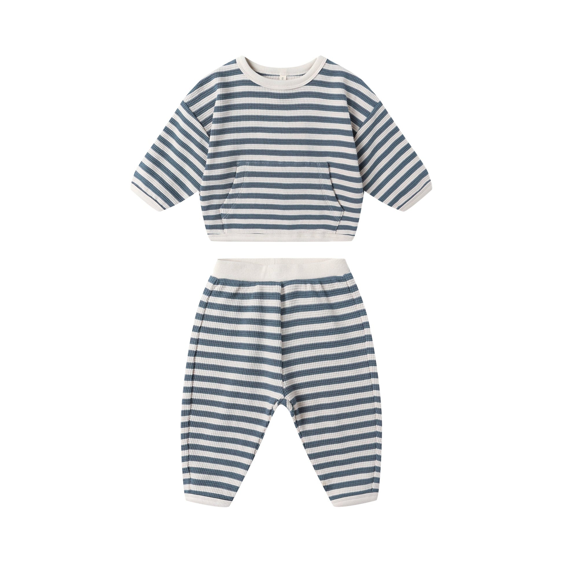 Our Waffle Slouch Set includes a long sleeve top with a large front pocket and matching pants—perfect for lounging and play.