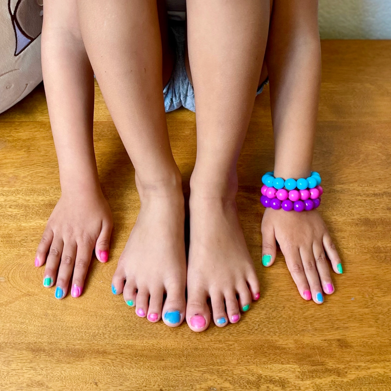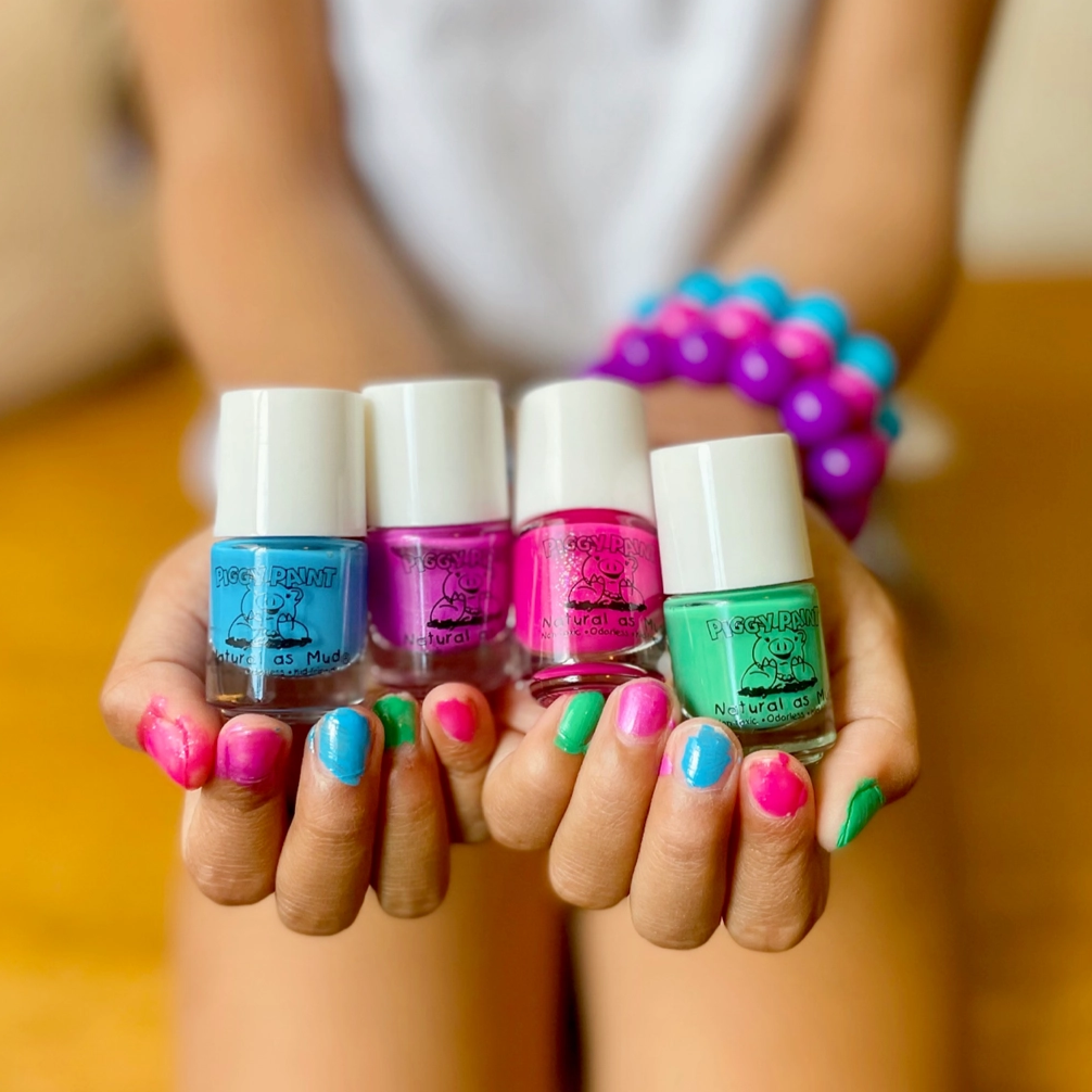 This box set contains 4 Piggy Paint mini polishes, 3.5 mL Fairy Berry, Neon Lights, RAIN-bow or Shine, Awesome Blossom
