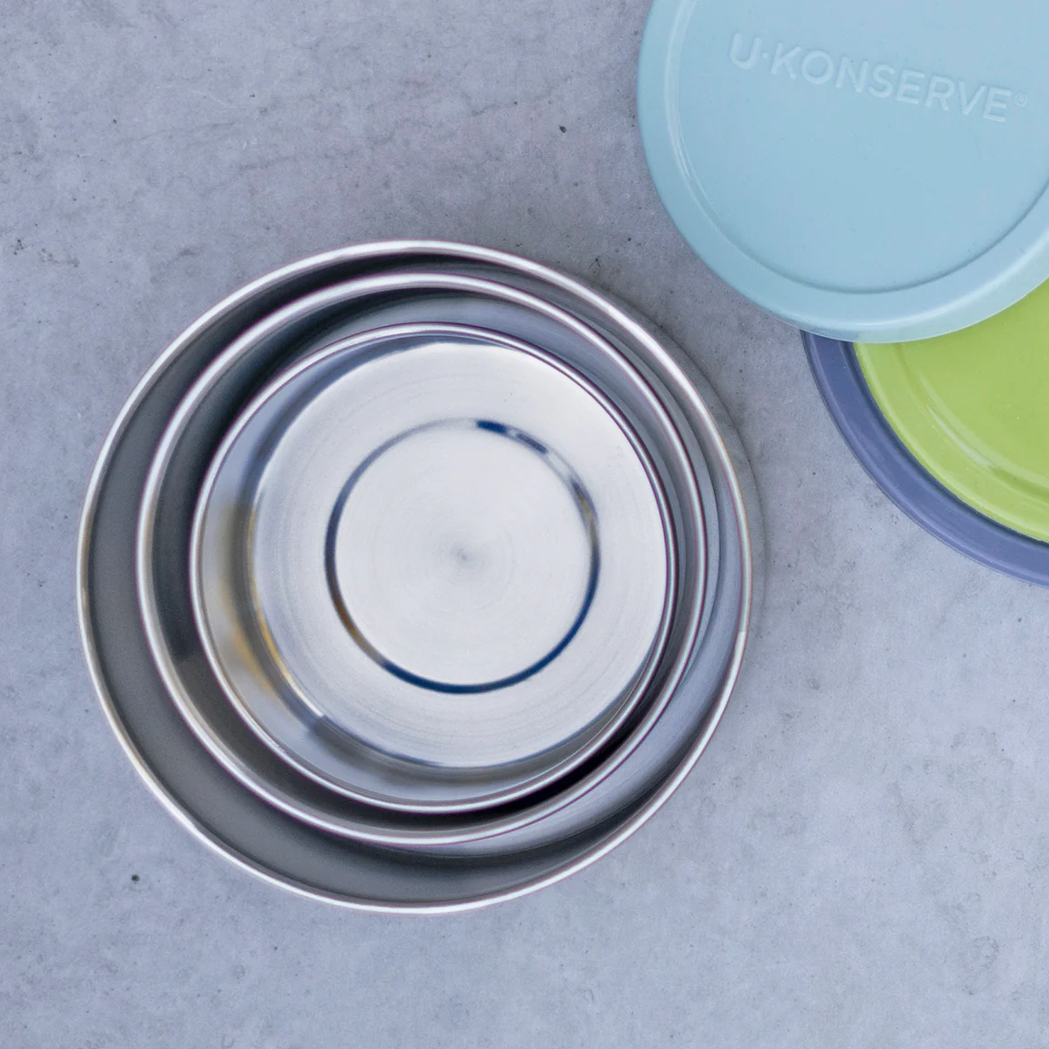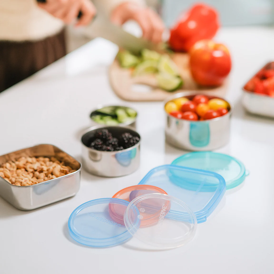 Our trusted stainless steel nesting containers now come with plastic-free silicone lids! Perfect waste-free solutions for kids lunches, picnics, travel, outdoor adventures and bulk shopping. The stainless steel nesting set (16oz, 9oz and 5oz) are great for large and small snacks, help reduce single-use packaging, and are versatile enough for many food-storage needs at home and on the go. Our round containers are also ideal for kitchen organization, pantry makeovers, meal prep and family leftovers. Flexible silicone lids are easy for little hands to open, and the leak-proof feature keeps spills at bay. Our new non-toxic stainless steel and silicone combination make these lunchboxes the best zero-waste solution for you and the planet.