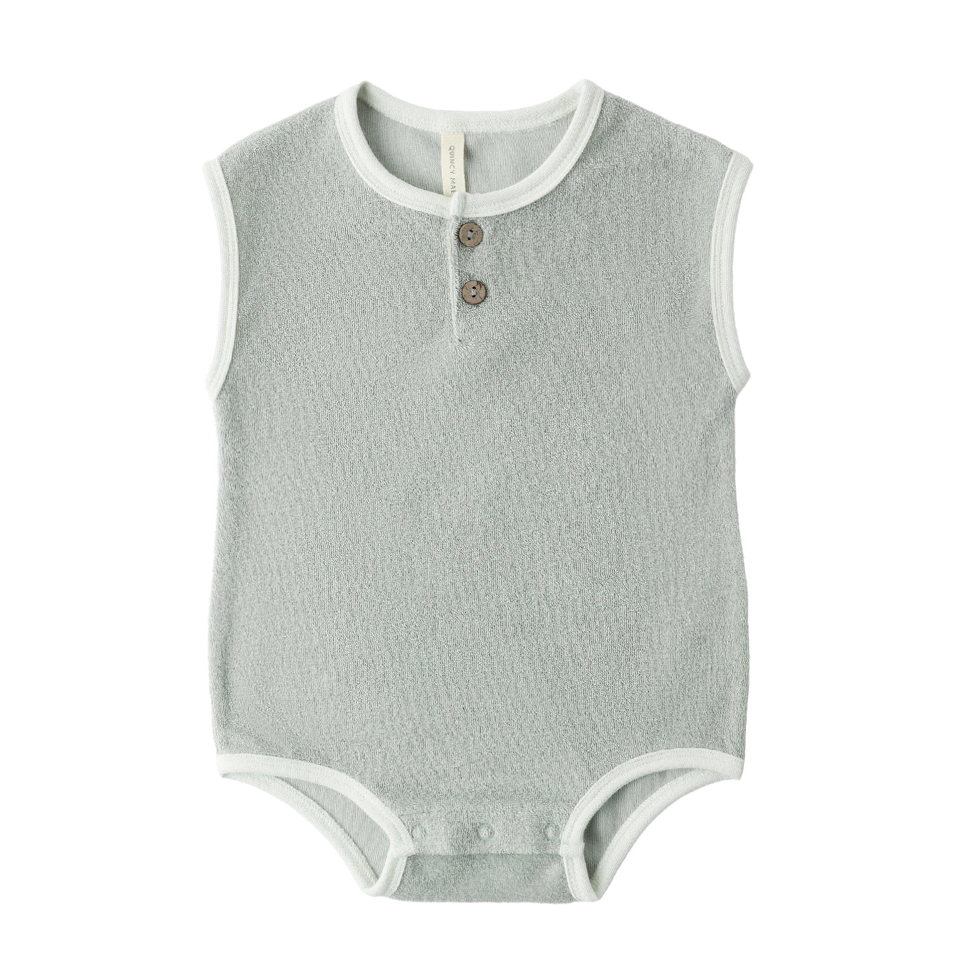 Our Terry Cloth Romper features ivory contrast binding, front placket with coconut buttons, and bottom snaps for easy changing. Featuring our 'sage' hue. Care: Machine wash cold. Tumble dry low. Made of 96% organic cotton, 4% elastane.