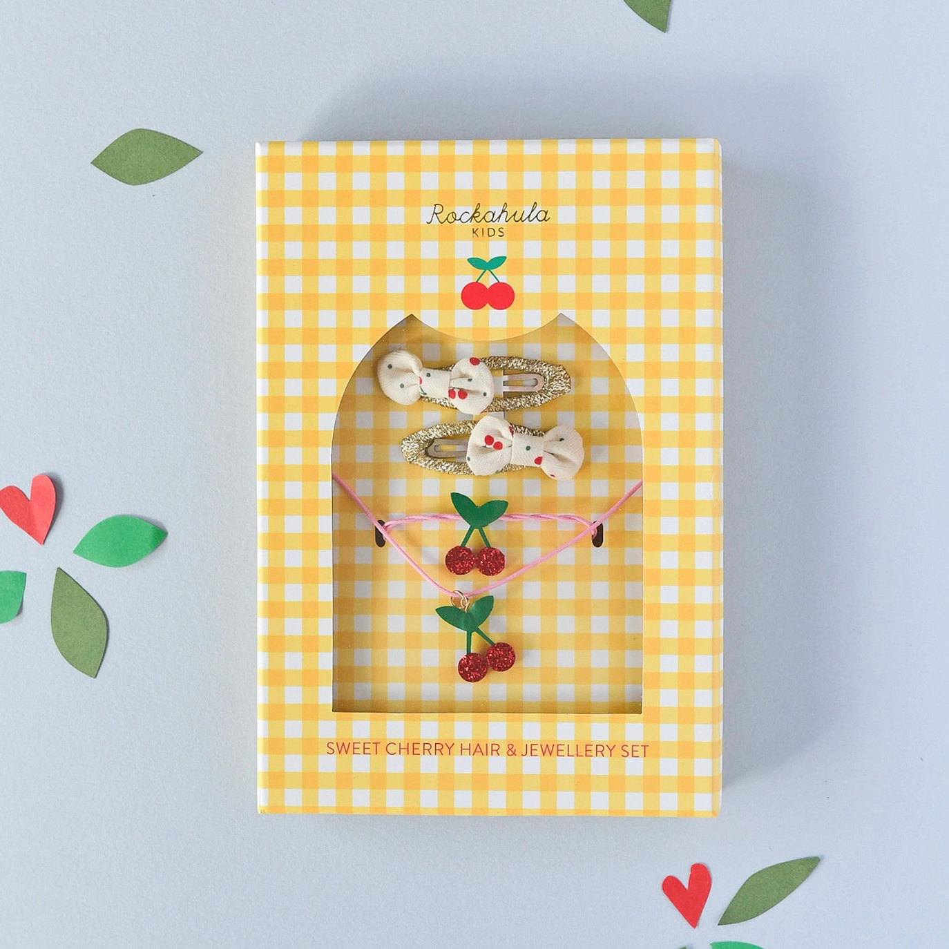The set includes two clips with our cherry fabric bows, a sweet cherry necklace and bracelet.