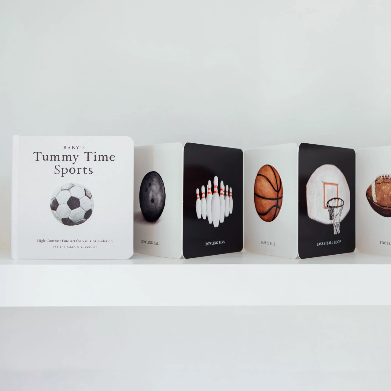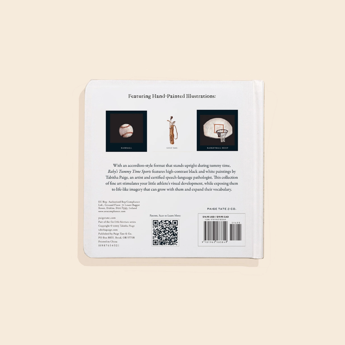 This high-contrast baby book features striking black-and-white sports artwork designed to support your baby’s visual development. The unique accordion-style format stands upright on its own—making it perfect for tummy time!